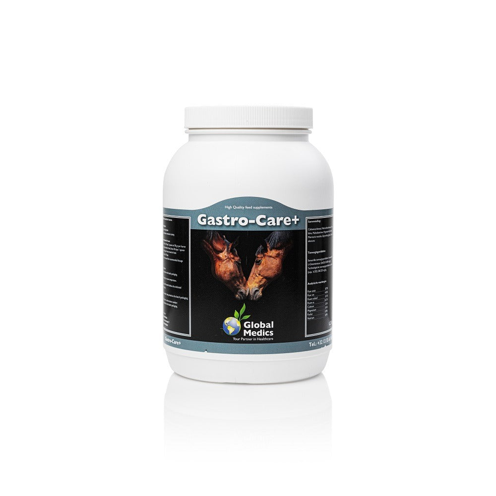 Maagproblemen zijn veel voorkomend bij paarden; zowel bij sportpaarden als bij recreatiepaarden, fokmerries en zelfs jonge veulens. Maagcomplicaties ontstaan doordat het maagslijmvlies beschadigd raakt door een te zure maaginhoud met een maagontsteking of maagzweren tot gevolg. Paarden met maagcomplicaties hebben vaak last van de volgende symptomen: verminderde eetlust, verminderde prestaties, slechte vacht, knarsetanden en gewichtsverlies. Gastro-Care+ neutraliseert enerzijds het overtollige maagzuur en anderzijds wordt het maagslijmvlies beschermd tegen irritatie. Dankzij de toevoeging van glutamine en natriumbicarbonaat vernselt Gastro-Care+ het herstel van het beschadigd slijmvlies. Matricaria recutita en magnesium hebben een verzachtende werking op het maag- en darmslijmvlies wat het onaangenaam buikgevoel verzacht. Gastro-Care+ heeft een uitermate krachtige en beschermende werking op het maagslijmvlies en zorgt dat maagcomplicaties bij paarden minder snel optreden.
